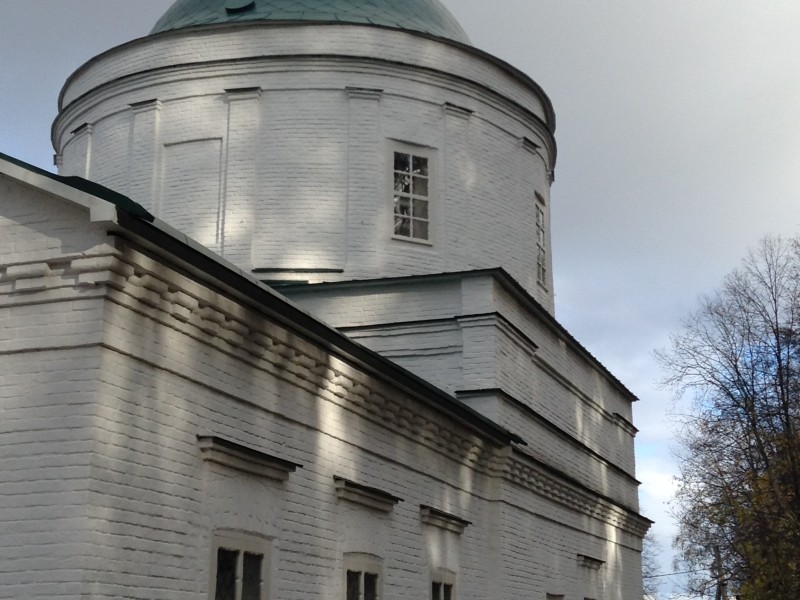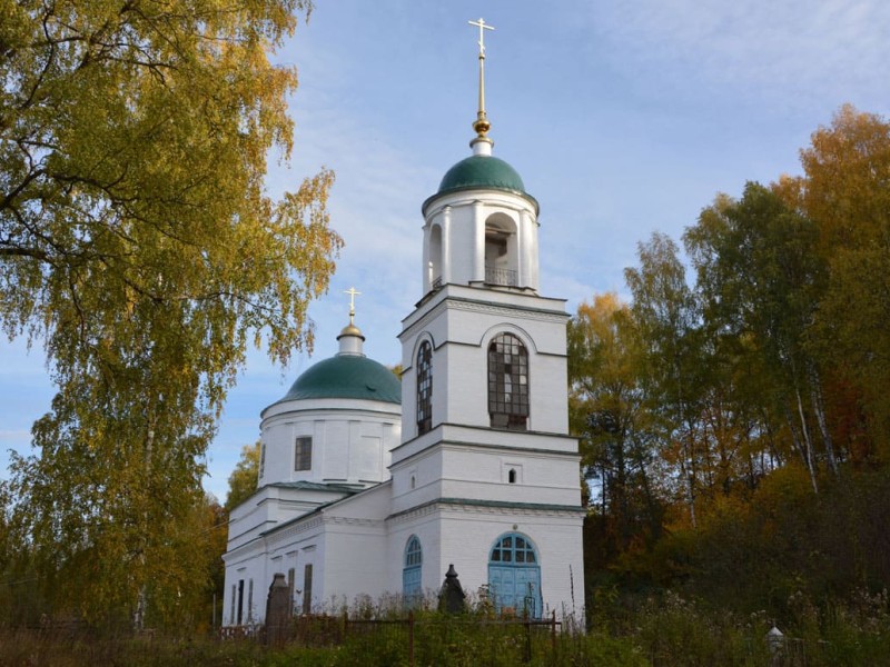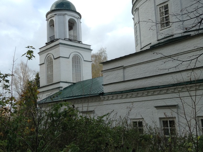 В церкви три придела: в честь Преображения Господня, в честь Владимирской иконы Божией Матери и во имя святителя Николая Чудотворца. Скромное декоративное убранство имеет плоскостной характер и включает неглубокие прямоугольные ниши на четверике, в которые помещены прямоугольные проемы, антаблемент с сухариками, завершающий алтарь, трапезную и основной ярус четверика, тяги на аттике и пилястры на ротонде. Рамочные наличники окон с сандриками соединены тягой, окна ротонды не имеют обрамлений. Боковые фасады трапезной и четверика в три оси, на средней оси в четверике расположены входы.